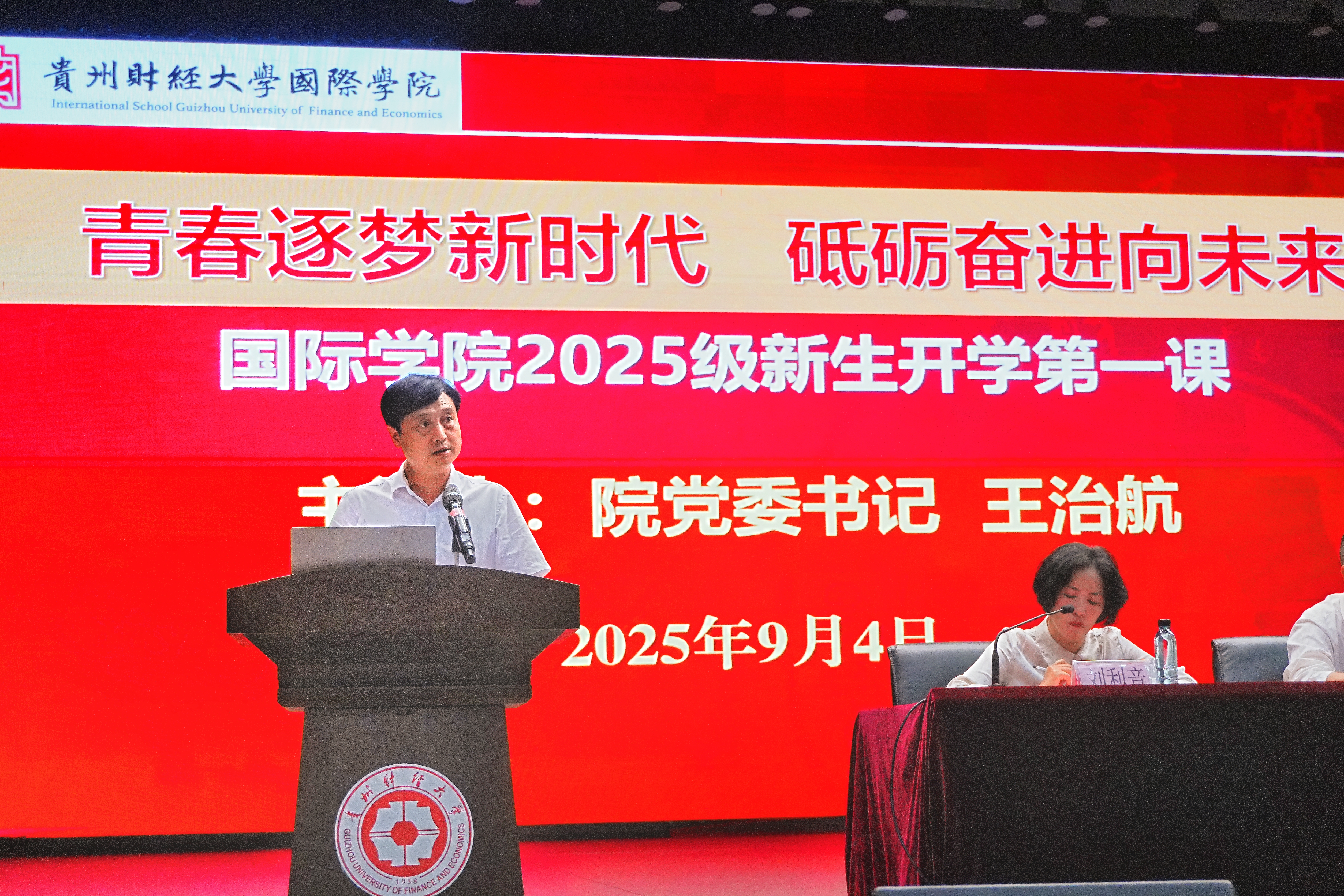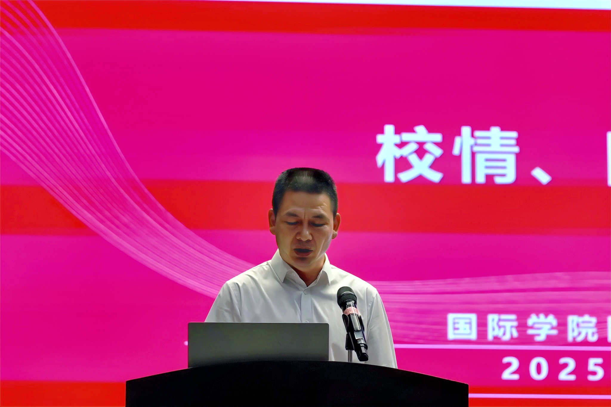 姜友文介绍学校和学院发展历程、国际化办学特色及人才培养成果。向同学们详细介绍了学校和学院的历史和发展现状。勉励新生珍惜时光、树立理想,积极参与国际交流与实践,成为具有国际化视野和跨文化交流能力的高素质人才。