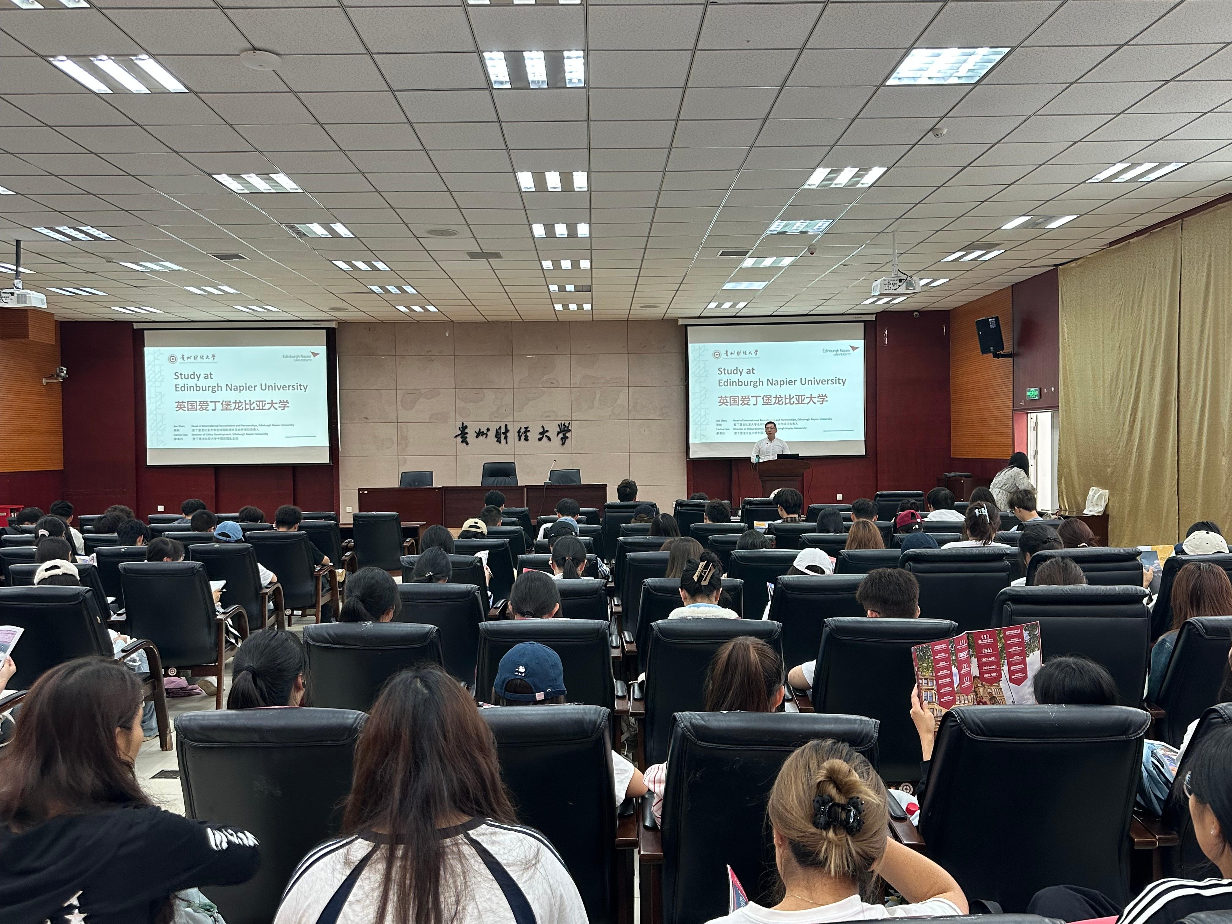 邱俊宁 图文报道)10月15日,英国爱丁堡龙比亚大学全球国际招生及合作项目负责人Joe Zhou、中国区招生主任Carina Liao到我院为金融学专业学生开展爱丁堡龙比亚大学项目宣讲会,金融学专业共250余名学生参加。