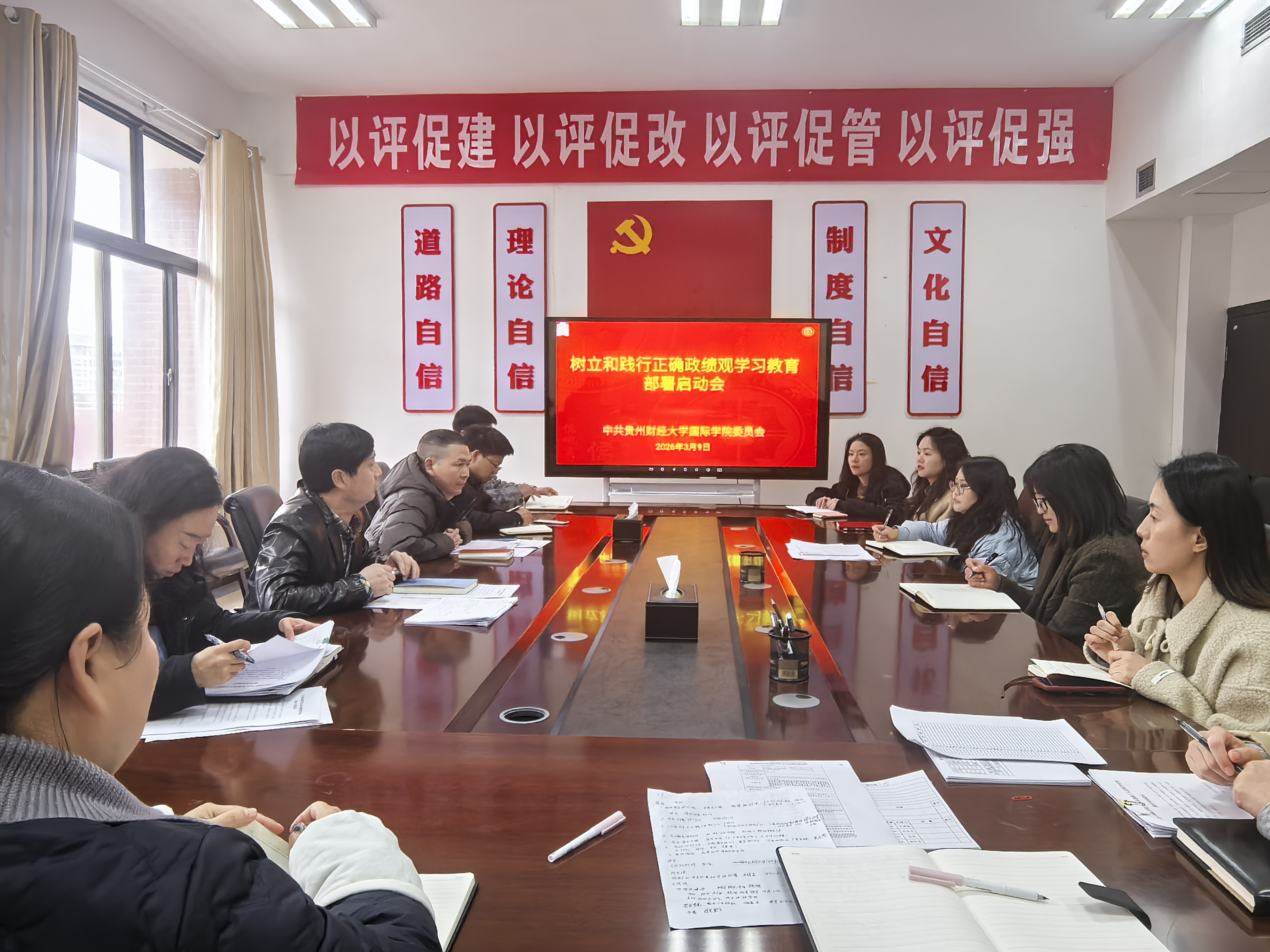 党委在正德楼413会议室召开树立和践行正确政绩观学习教育启动部署会暨2026年第一季度支部书记工作例会。会议由学院党委书记王治航主持,学院党委副书记、院长姜友文,党委副书记陈嵩、专职组织员及各党支部书记参会。