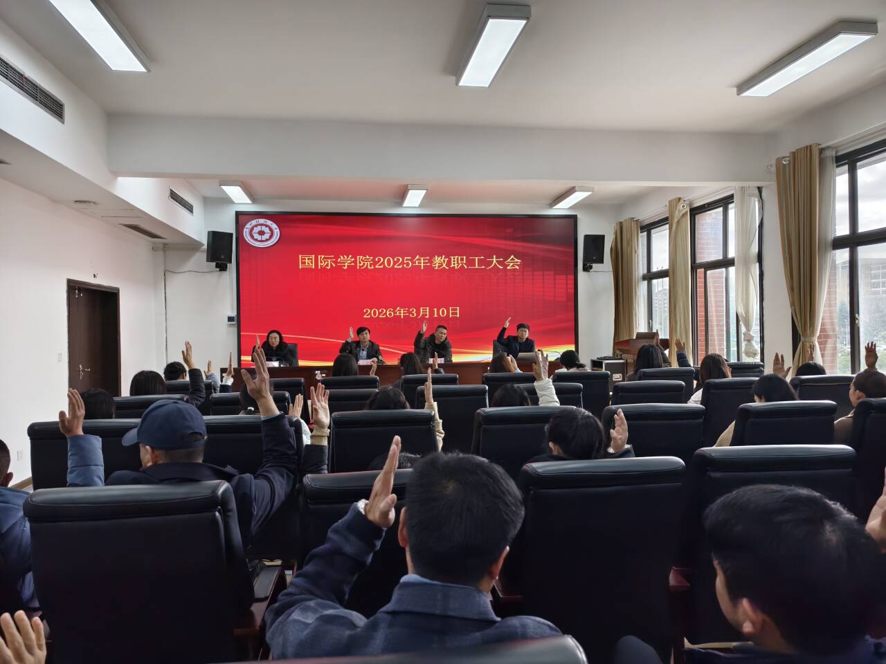 院长姜友文作题为《深耕内涵提质效 勇毅创新向新程》的年度工作报告。报告全面回顾了2025年学院在党建引领、人才培养、国际交流与合作、校地协同、学生工作、管理服务、校园文化等方面取得的成果与特色亮点,客观剖析了现阶段学院发展存在的短板,明确提出2026年学院工作的核心目标与重点任务。报告指出,2026 年是 “十五五” 规划的开局之年,学院将以习近平新时代中国特色社会主义思想为指导,紧扣教育强国建设要求,立足贵州内陆开放型经济实验区建设机遇,以党建为引领,深化内涵建设,建强师资队伍,拓展国际合作,创新育人模式,优化行政保障,全力推动学院国际化教育事业高质量发展。